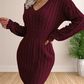 Women’s V-Neck Knitted Sweater Dress | Elegant Sheath Cocktail Dress | Long Sleeve Winter Fashion Dress
